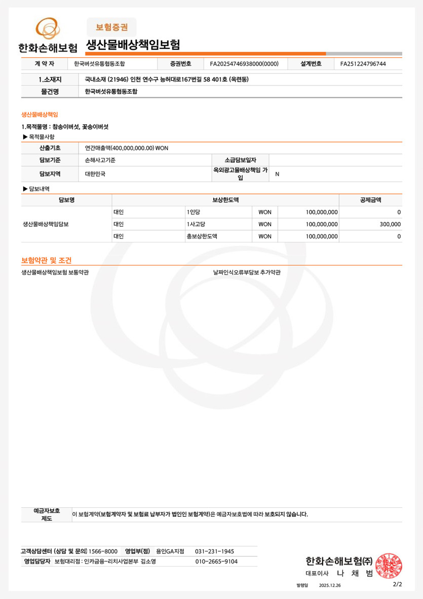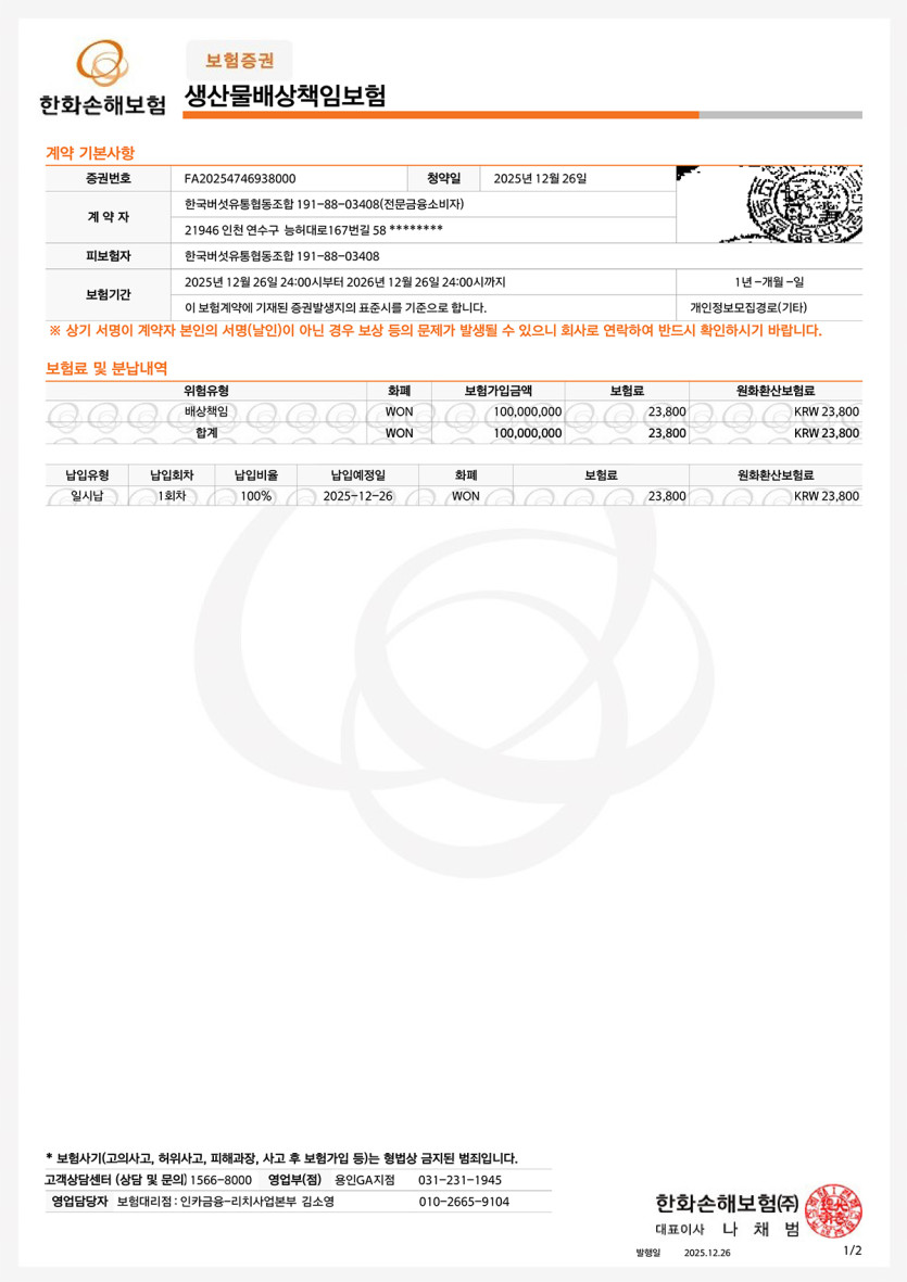 생산물배상책임보험증권 작성자 정보 최고관리자 작성 작성일 2026.01.13 10:58 컨텐츠 정보 1 조회 목록 본문 생산물배상책임보험증권 SNS 공유 관련자료 이전 원산지증명서 작성일 2026.01.13 11:00 다음 무농약인증서 작성일 2026.01.13 10:54 목록